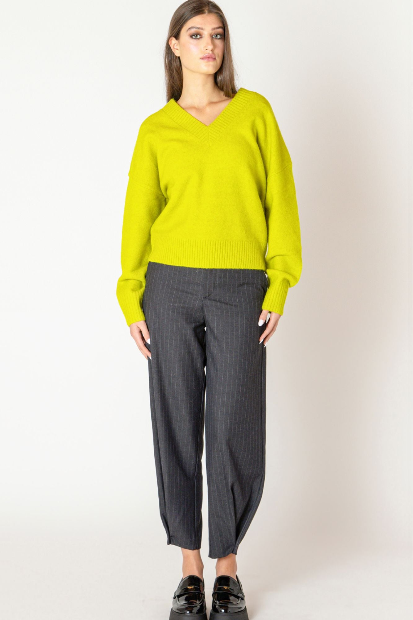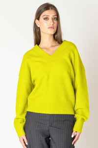 Step into the spotlight with this Soft Rib Trim Sweater! Featuring a playful V-neck and cozy dropped shoulders, its ribbed trim adds just the right touch of texture. Slightly oversized for ultimate comfort, this sweater wraps you in warmth and bright, cheerful color—perfect for turning heads and lifting your mood all day long.