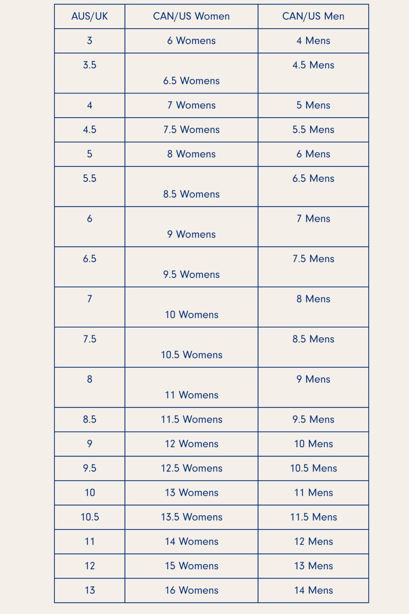 *Sizes are shown in Women’s Canadian