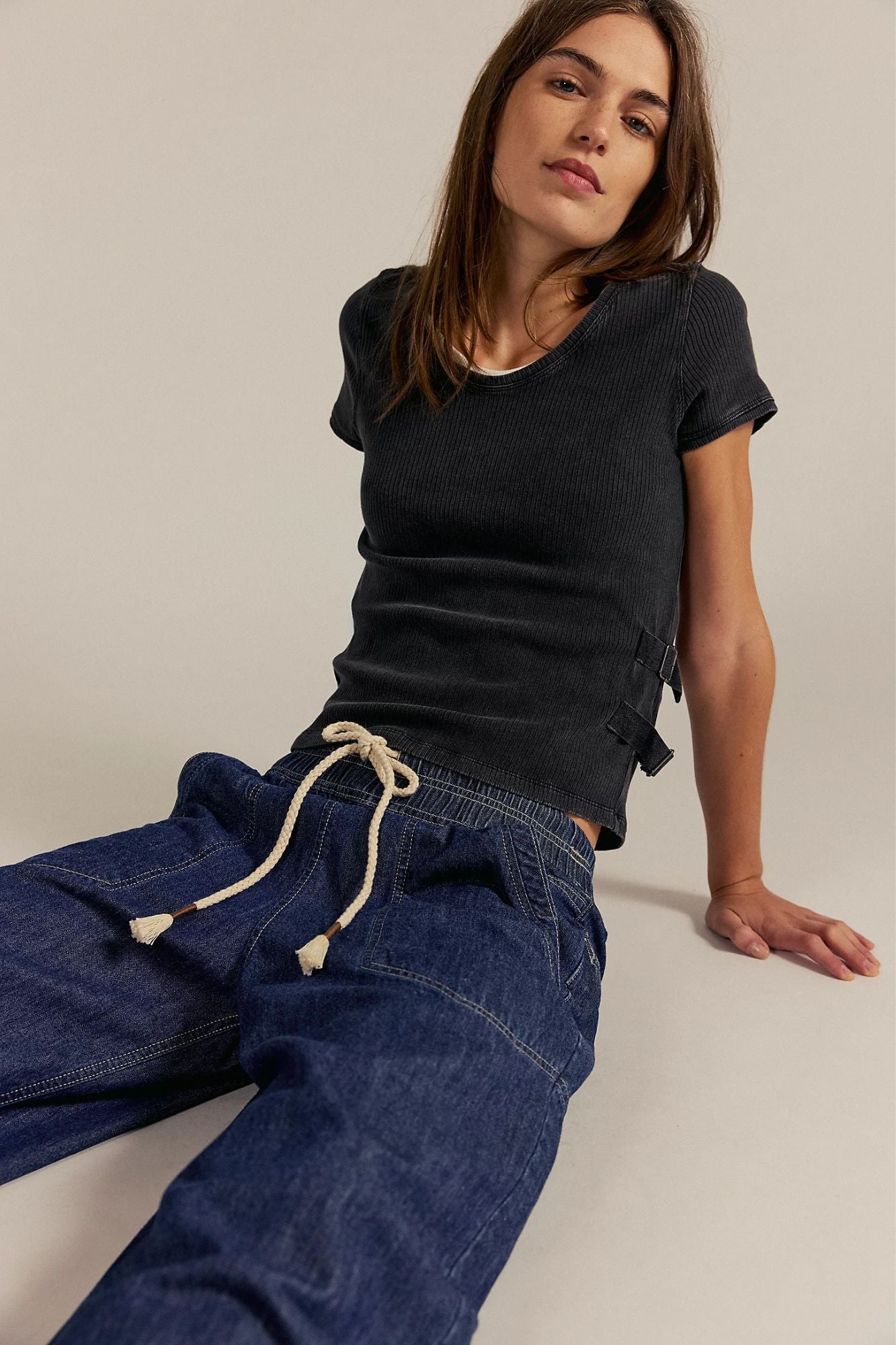Mid-rise slouchy boyfriend jeans that do the heavy lifting for you. Pull-on design with a corded drawstring means zero fussing—just slip them on and go. Oversized patch pockets add practical style, while the soft rigid denim keeps its shape through endless wear. Pair them with court sneakers for laid-back vibes or dress them up with ballet flats for something sleeker. One pair, infinite outfit possibilities.