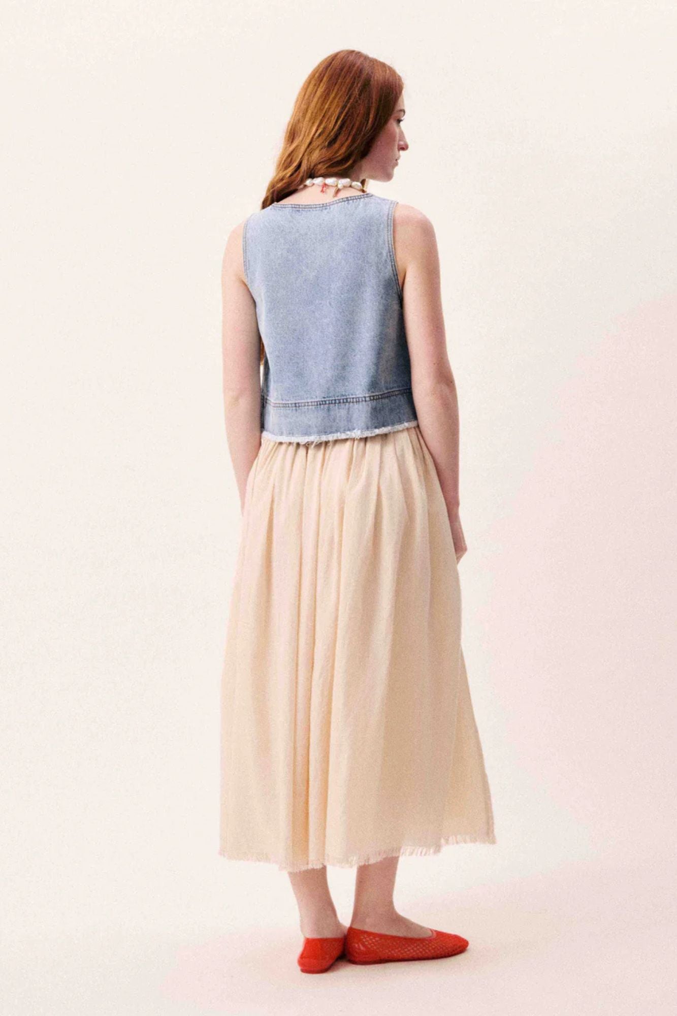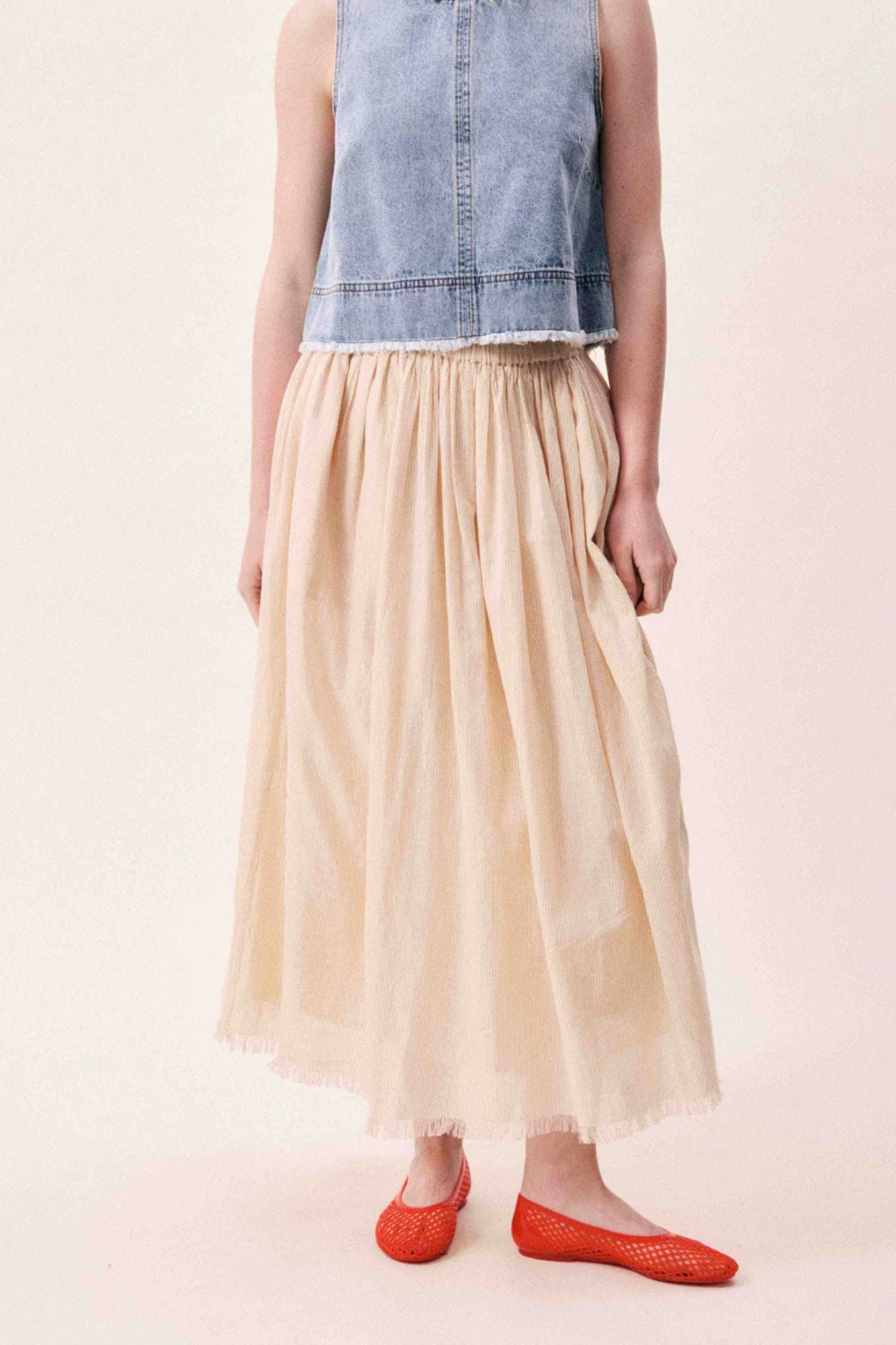 The Mary Skirt is a timeless long pleated design in a soft pinkish beige tone. Featuring vertical pleats that run the full length, this skirt offers elegant movement and dimension with every step. The high elasticated waist ensures a comfortable, secure fit, while the fluid, lightweight fabric drapes beautifully without clinging. Perfect for creating effortless, polished looks that transition seamlessly from day to evening.