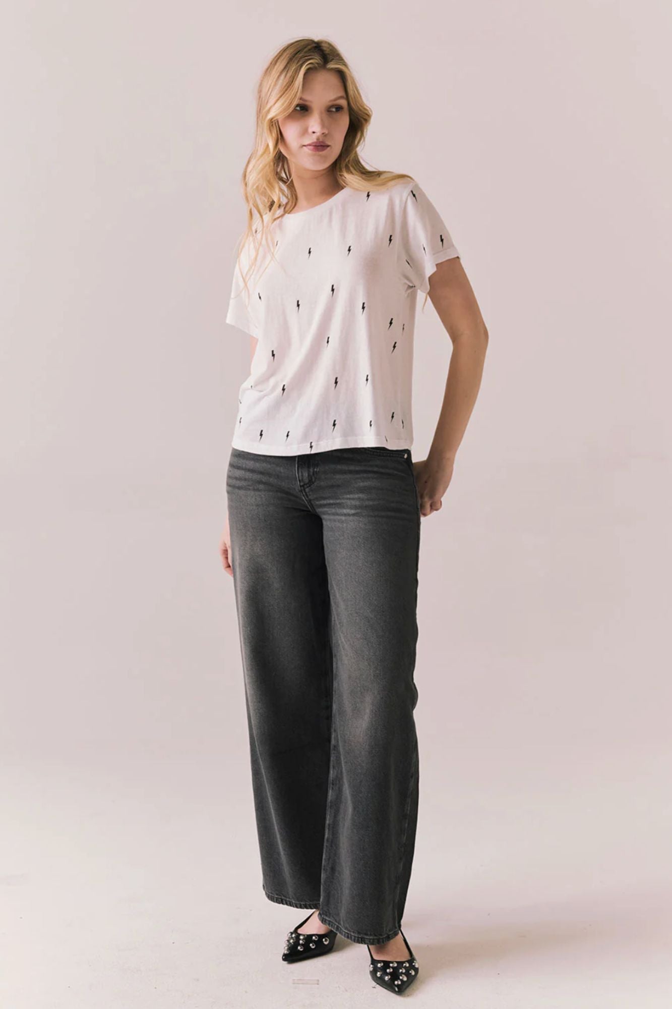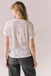 The Tossed Bolts Tee in white brings rebellious edge to your everyday rotation. Black lightning bolts scattered across the soft jersey create instant rocker vibes that work whether you're dressing up or down. Pair it with ripped denim and boots for a night out, or throw it on with joggers for weekend ease. Layer with a leather jacket to amplify that vintage 80s attitude. Effortless, versatile, and undeniably cool—this tee is the foundation piece every wardrobe needs.