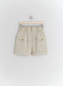 Shorts never go out of style. These high-waisted shorts with elastic waistband and fluid leg with A-line silhouette are super comfortable. Cotton and linen fabric has a rustic effect, and the turned-up hem hints at a more modern look.
