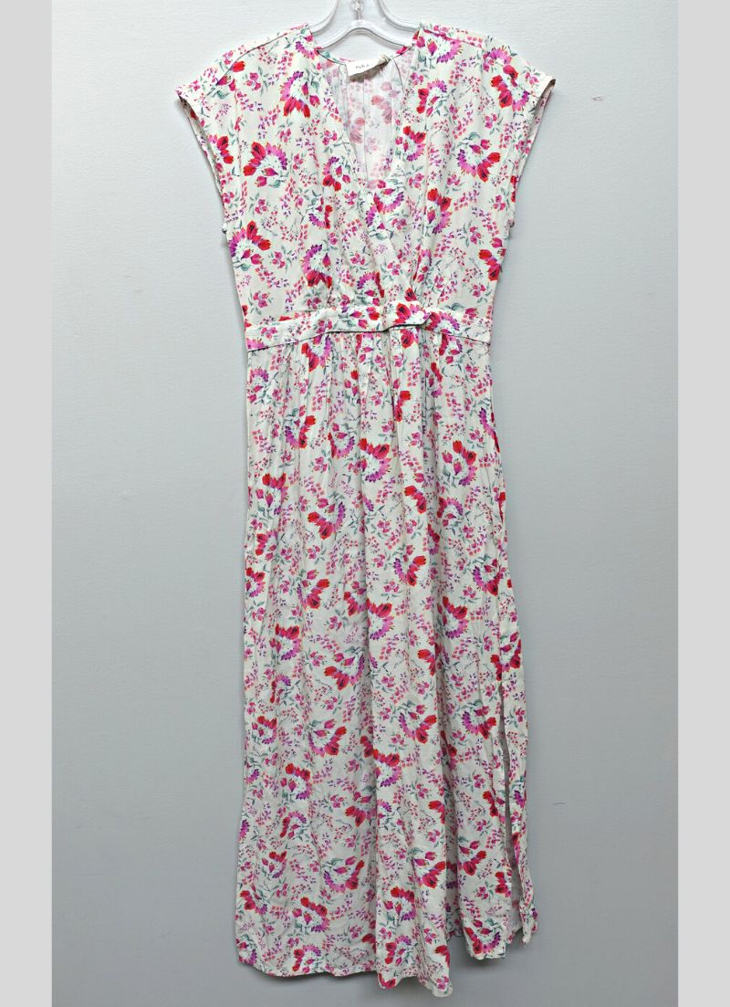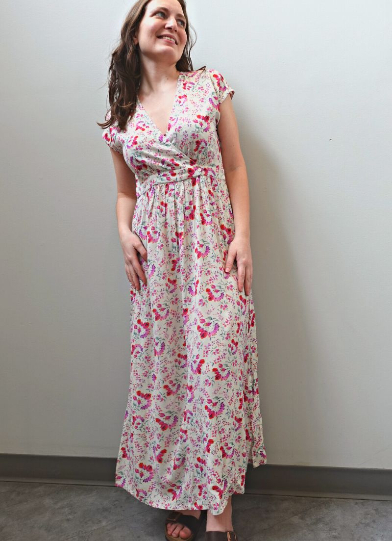 The Elis a is maxi dress with a faux-wrap top. It features a flatering v-neckline and an invisible zipper on the side.