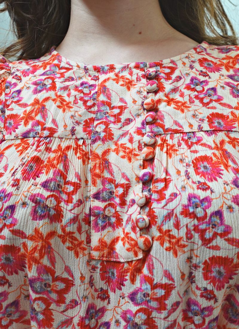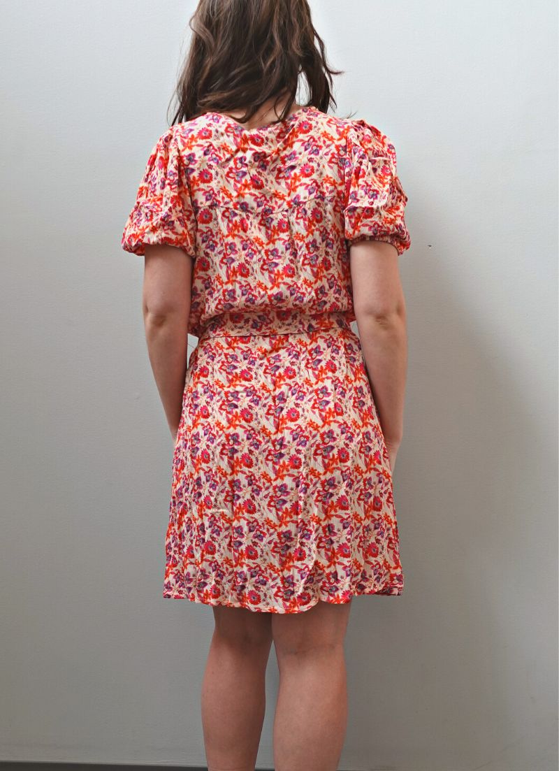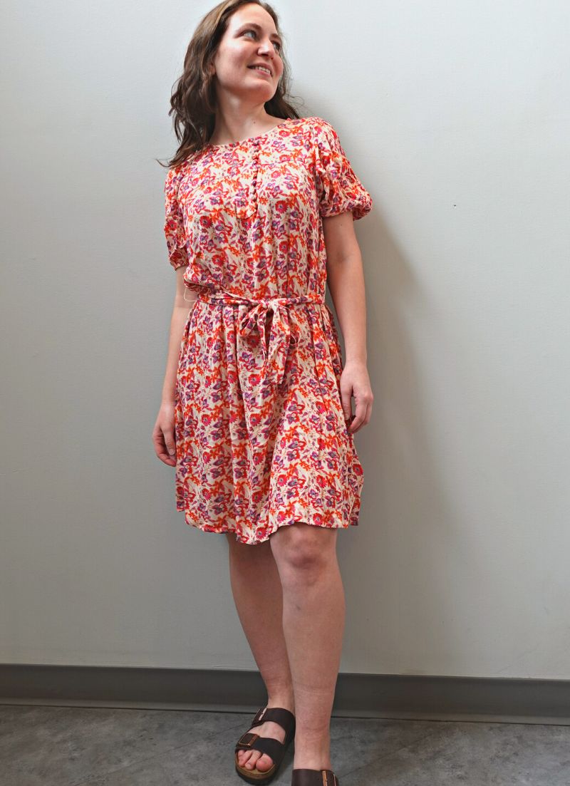 The Haven is a short dress with puffy sleeve and a crew neckline.