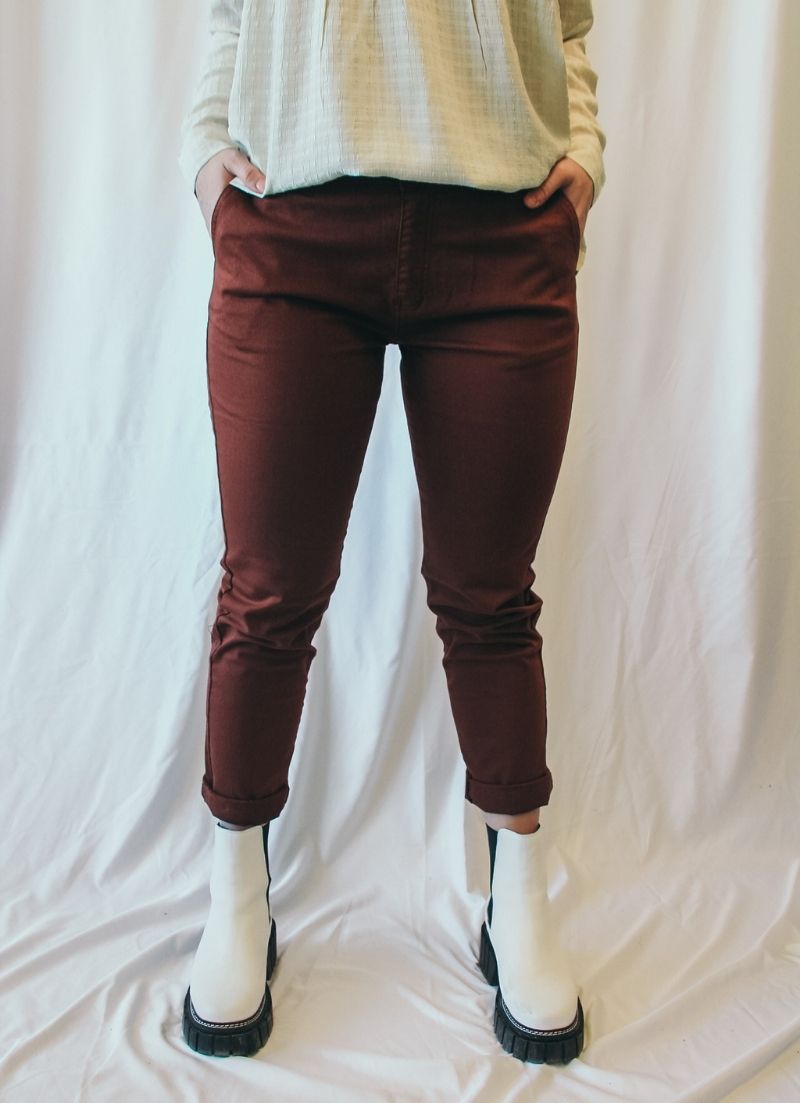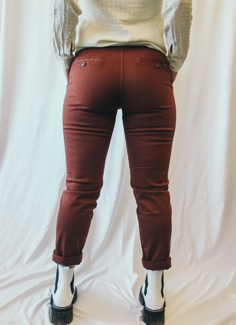 A stretchy chino style pant in a rich rust colour. Swap your jeans for the Desert Pants. A slim fit that hits at the ankle.