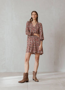 Evaline is a v-neck, knee length dress; featuring cuffs, a seam at the waist and ruffle detailing on the skirt.