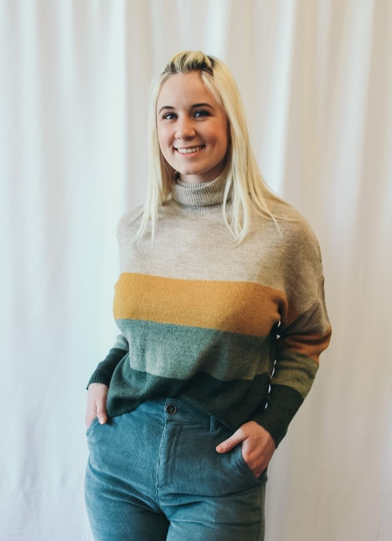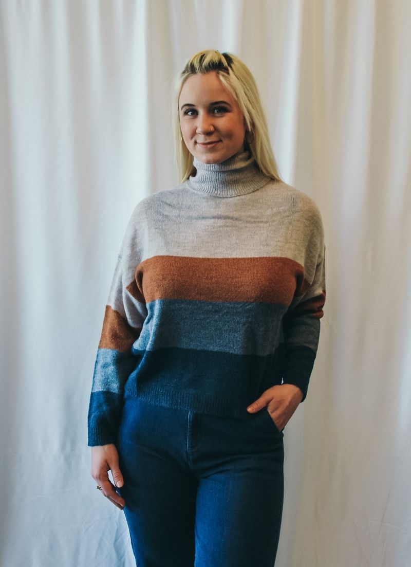 The Jamey Sweater comes in two colour ways - Green and Blue. A fun stripe, colour block design that jazzes up a regular turtleneck sweater.