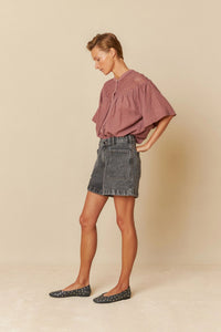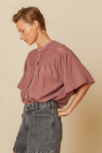 Crafted from 100% organic woven cotton, this blouse boasts 3/4 length sleeves and a delicate lace insert on the yoke. Experience the perfect blend of comfort and style in this blousy top.
