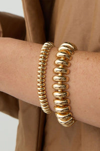 Embrace elegance with the Sofia Bracelet! This eye-catching piece features a ribbed texture and a unique caterpillar construction, giving it a fluid and stylish look. The vintage-inspired foldover closure adds a touch of sophistication, while the high-polish gold finish adds a modern touch. Perfect for adding a touch of glamour to any outfit.