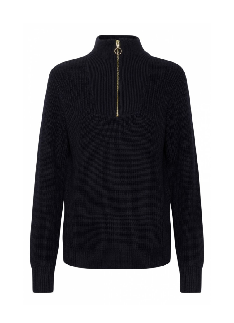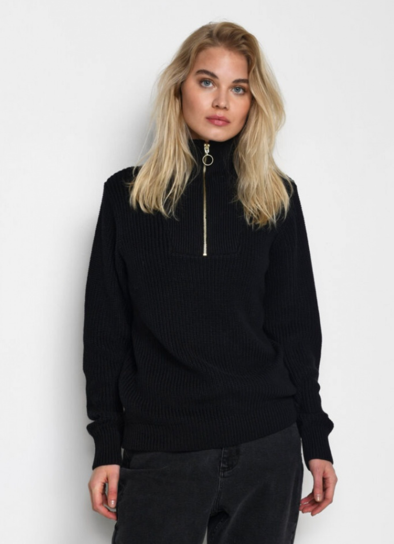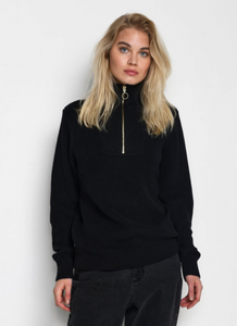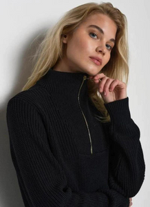 A loose fit pullover with long sleeves, a high neck and half zip.