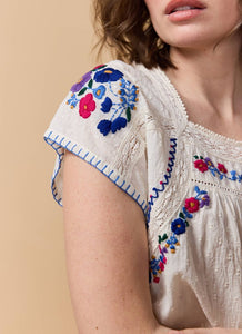This cotton blouse is perfect for any occasion with its short sleeves, delicate lace trim, and charming floral embroidery. Add a touch of atmosphere to your wardrobe with this playful and stylish top!