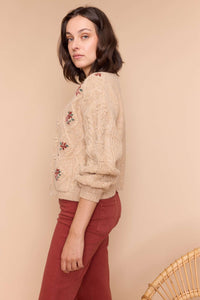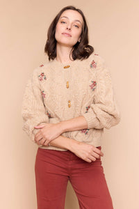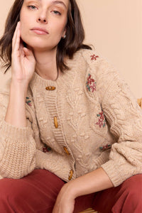 Stay cozy and stylish in our Campervan Cardigan! This thick, folk-style cardigan features intricate twists and playful flower embroidery, all fastened with wood-effect buttons. Perfect for adding a touch of quirky charm to any outfit. (Knit your way to comfort and fun!)
