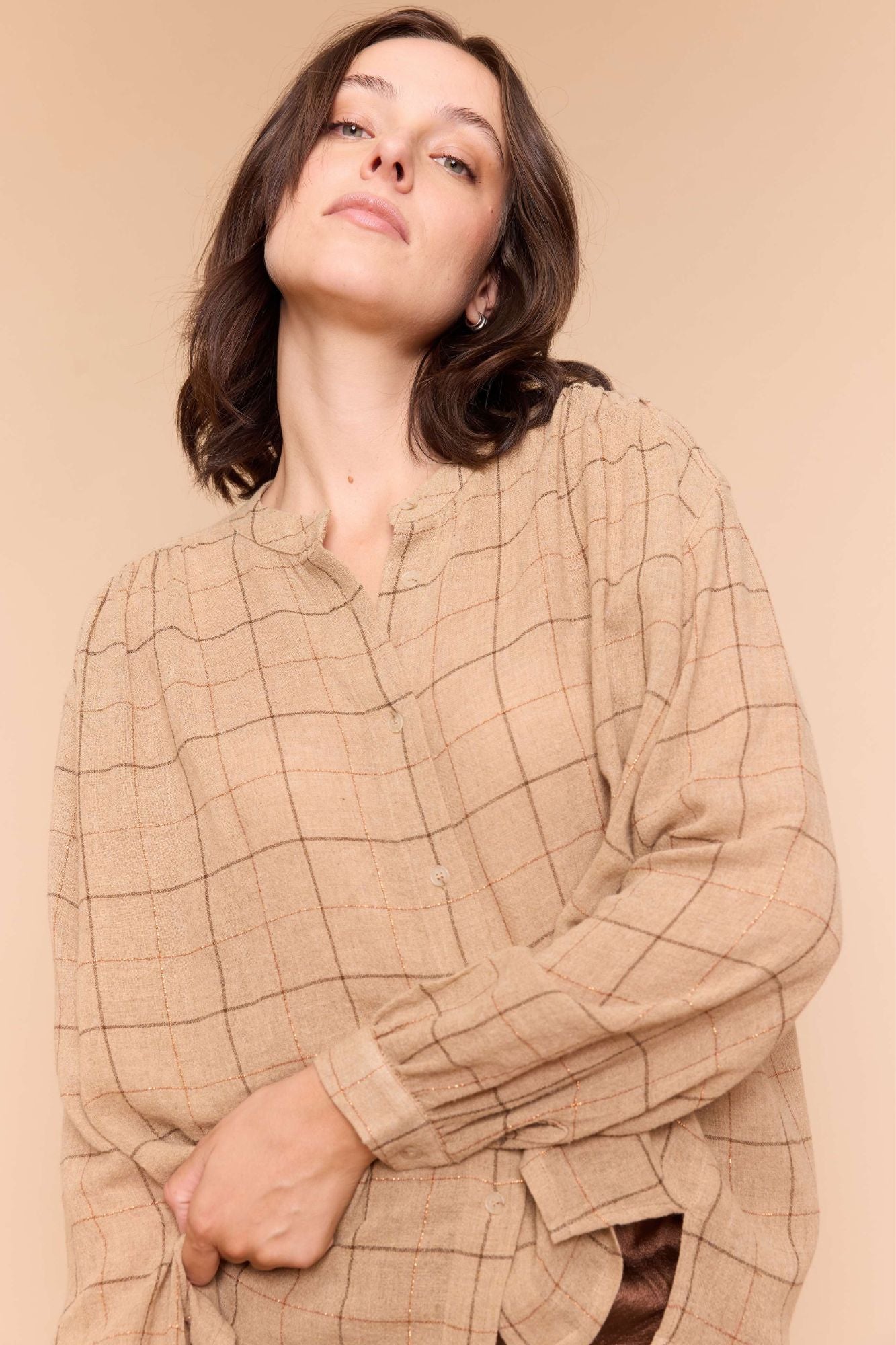 Show off your playful side with the Concordia Blouse! This round-neck shirt features a unique check pattern with a hint of shimmer thanks to the light lurex thread. The long sleeves and gathered shoulders add a touch of elegance to this otherwise quirky and fun plaid blouse.