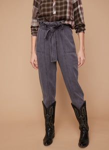The Louisiane pants have a high waist with a paperbag belt style. It features two large cargo pockets.