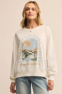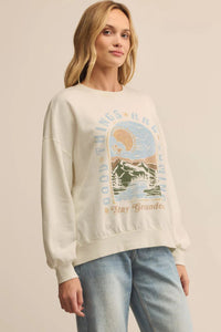 Bring on the good vibes in this cozy oversized sweatshirt, featuring a "Good Things Are Coming" screen print and scenic mountain-lake graphic. Made from ultra-soft brushed cotton fleece, it's the kind of easy layer you'll want to live in all season.