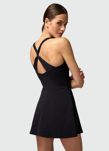 Active duty. A short-length active dress with a compressive fitting interior bodysuit, designed with a double-layer bra, flare skirt, and twist-back straps. Made in our 4-way stretch Dream Tech eco-conscious fabrication that is compressive, moisture-wicking, quick-drying, and anti-odor.