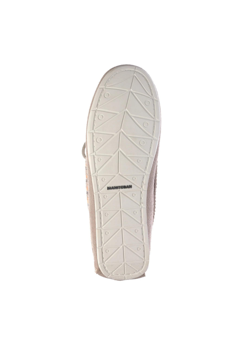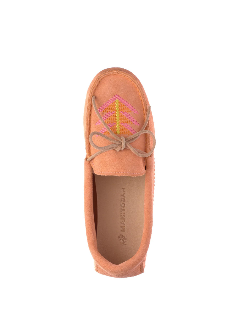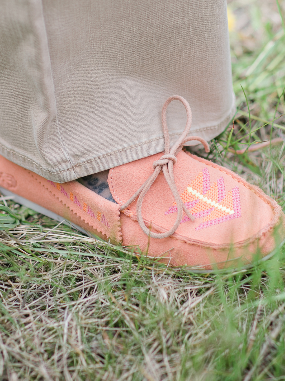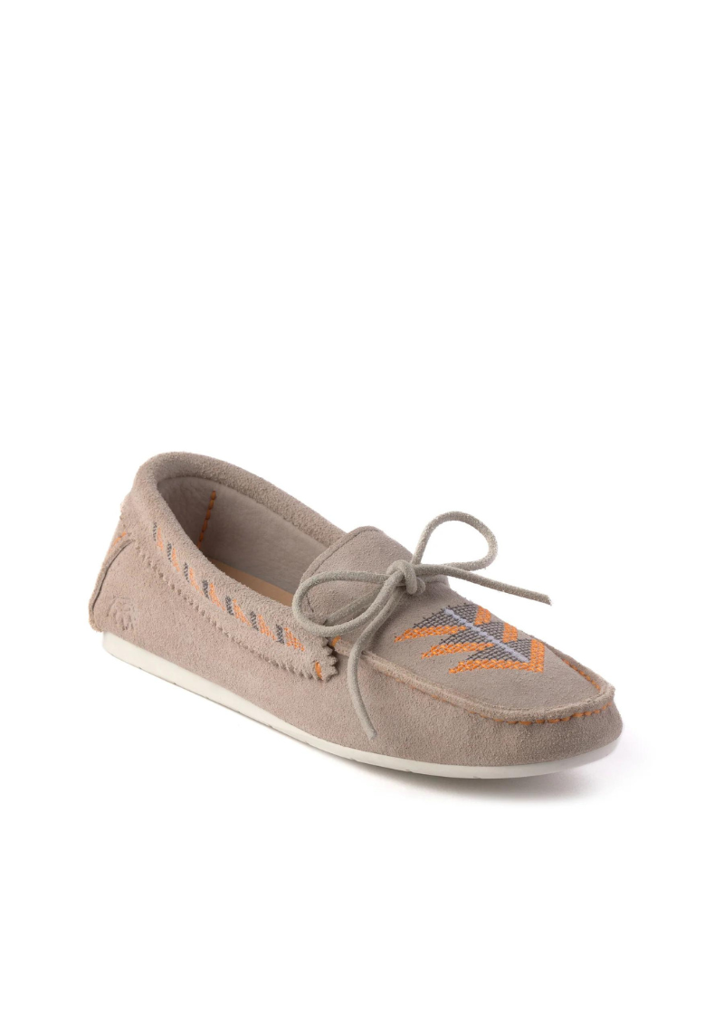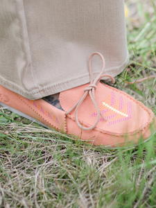 The Wallowa Moccasin – named after the Wallowa Valley on Mikailah Thompson's Nimiipuu homeland – features her geometric embroidery and outsole design while offering superior support and comfort with an EVA insole. Made with luxurious soft suede, the Wallowa Moccasin embodies modern moccasin construction while staying true to moccasin tradition and artistry.