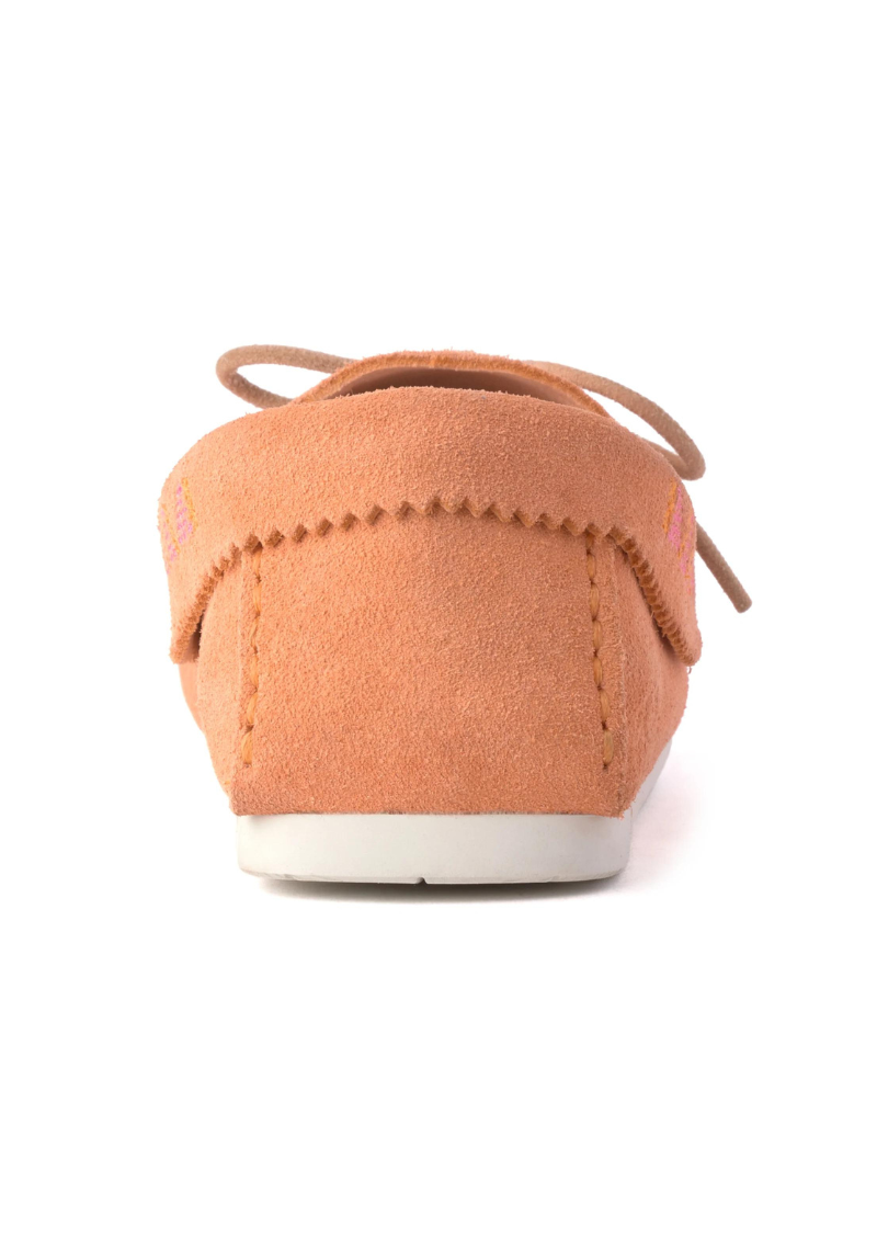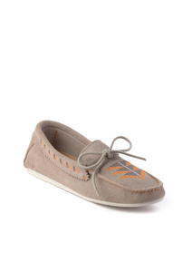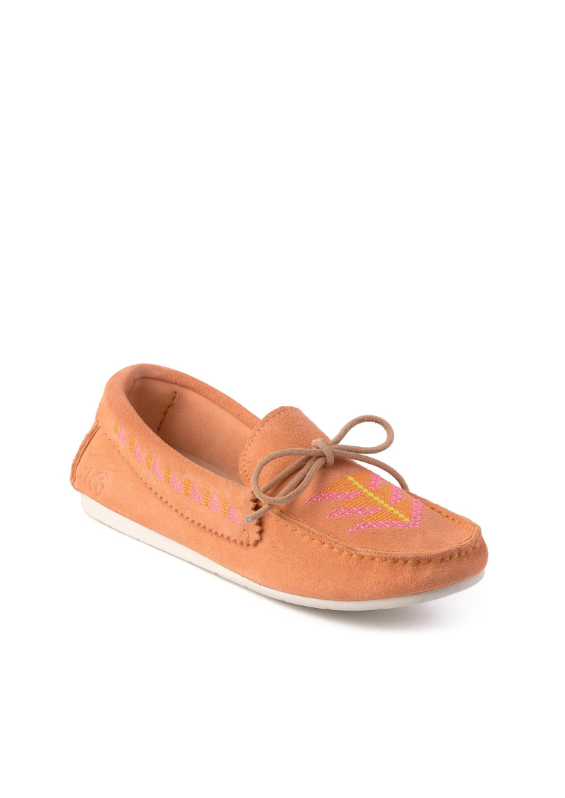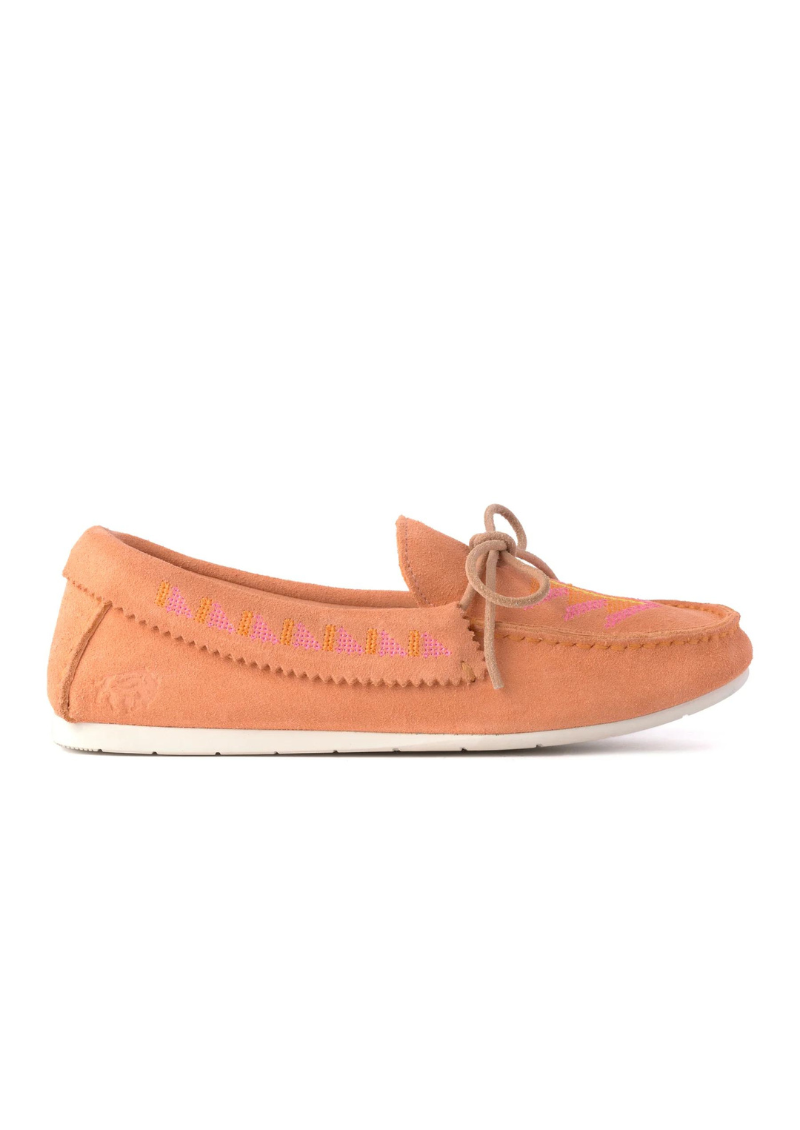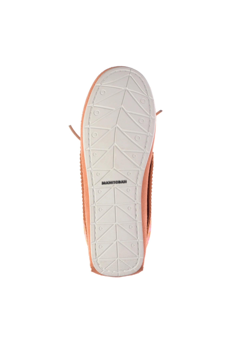 The Wallowa Moccasin – named after the Wallowa Valley on Mikailah Thompson's Nimiipuu homeland – features her geometric embroidery and outsole design while offering superior support and comfort with an EVA insole. Made with luxurious soft suede, the Wallowa Moccasin embodies modern moccasin construction while staying true to moccasin tradition and artistry.
