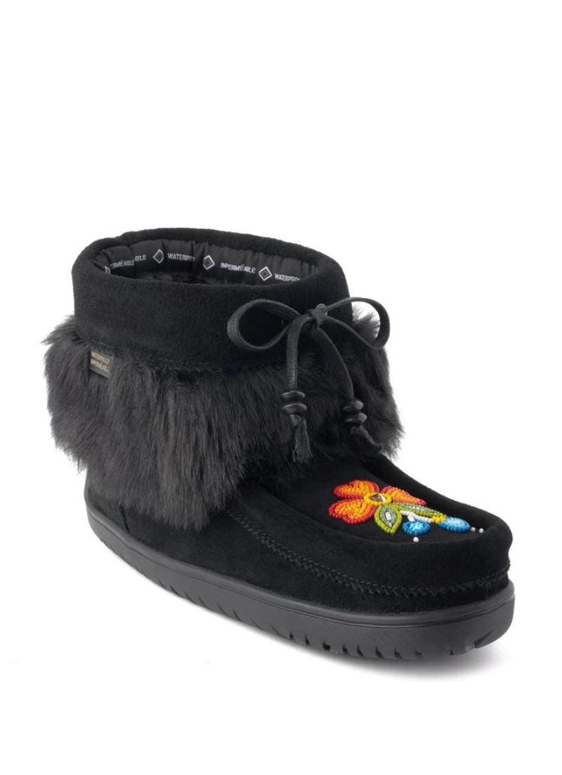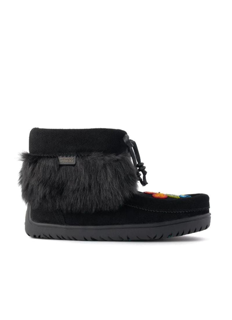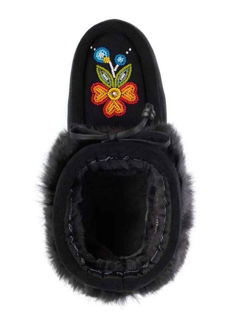 The Bloom Collection designed by Ojibwe artist, Shannon Gustafson using real glass crystals. Their beadwork comes to life on the black suede hides with vibrant florals, berries and leaves. These ankle mukluks are fully waterproof.