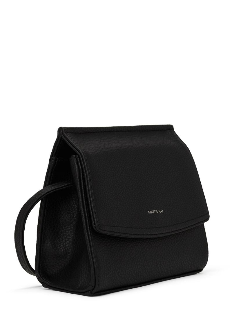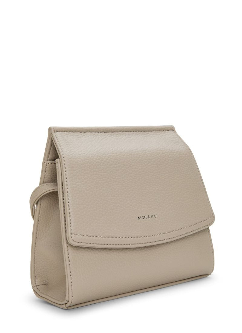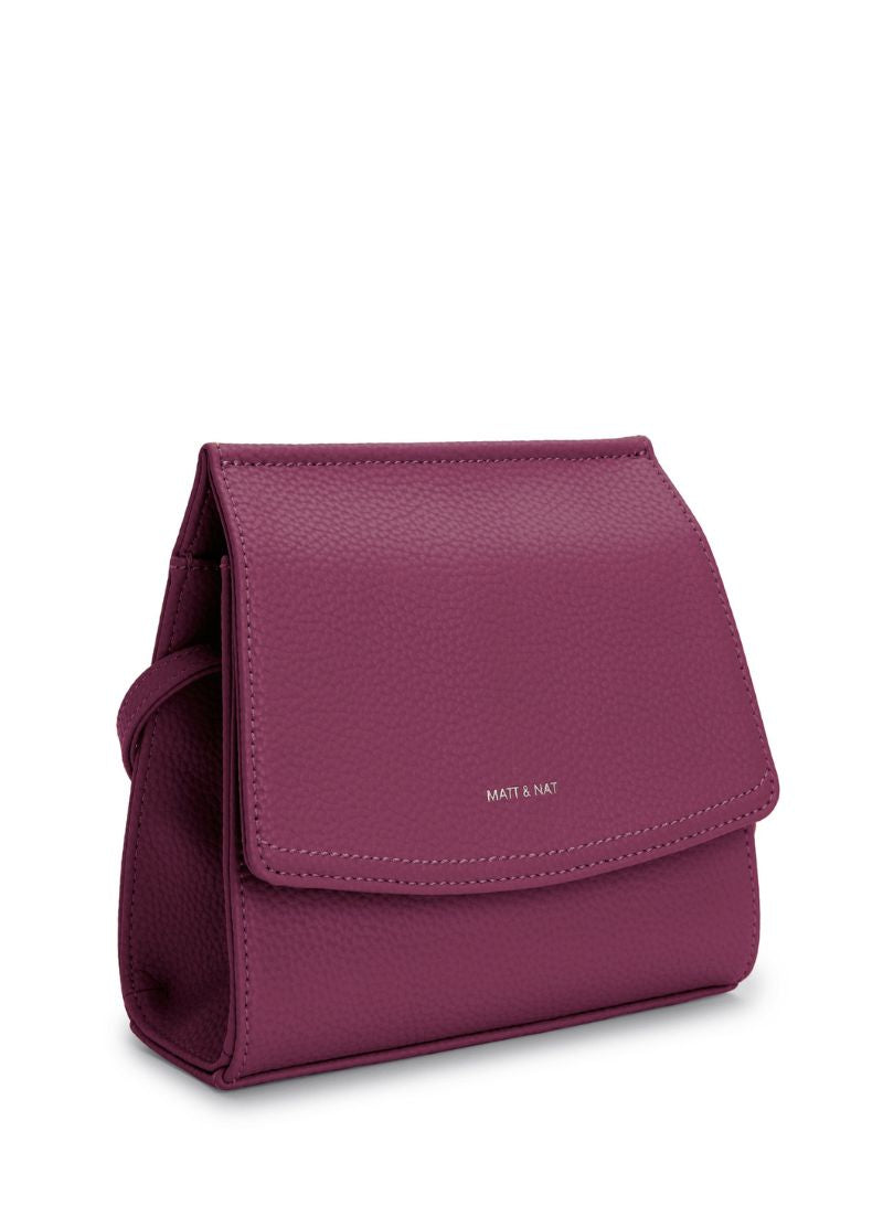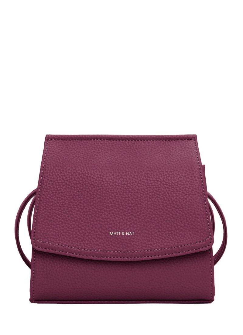 Crossbody bag with flap and hidden snap closure with an adjustable strap. Featuring a zipper compartment at interior front, zipper pocket on the back wall and logo embossed Purity patch.