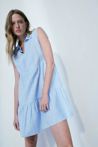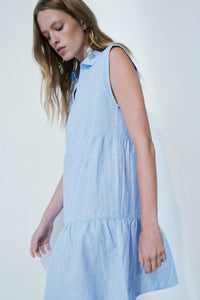 The Leane Dress is a lightweight, sleeveless piece crafted from a breathable blend of 75% linen and 25% cotton. It features a blue-and-white stripe pattern, a sporty collar, and a ruffled hem that adds a feminine touch. This versatile dress is perfect for warm-weather outings, offering both comfort and style.