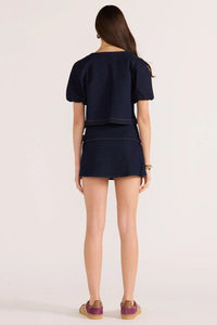 The Raya Tie Front Top brings a playful twist to your wardrobe with its deep V-neckline that flatters every figure. Puff sleeves add a soft, romantic vibe, while the tie-front lets you customize your fit. Its cropped length pairs perfectly with high-waisted jeans or skirts, and the dark denim wash gives it a bold, polished edge. Perfect for making a statement with effortless charm!