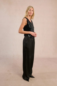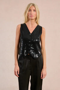 Shine bright in this show-stopping sequined vest that's equal parts glam and edge. The fitted front sparkles with eye-catching sequins while the sleeveless, button-up design keeps things cool and contemporary. A generous V-neckline flatters every frame, and the double-breasted closure adds a touch of sophisticated sass. Layer it over your favorite basics for instant party-ready polish, or wear it solo for maximum sparkle impact. Perfect for nights when you want to turn heads and steal the spotlight.