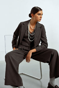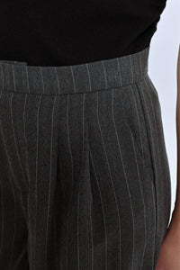 These pin stripe pants are your ticket to effortless retro-chic style. The high-waisted silhouette flatters your figure while front pleats add movement and dimension. A flared leg gives that classic '70s vibe, and practical side pockets keep your essentials close. Zip fly and hook closure ensure a secure fit all day long. Perfect for dressing up or down, these striped beauties are about to become your new favorite go-to.