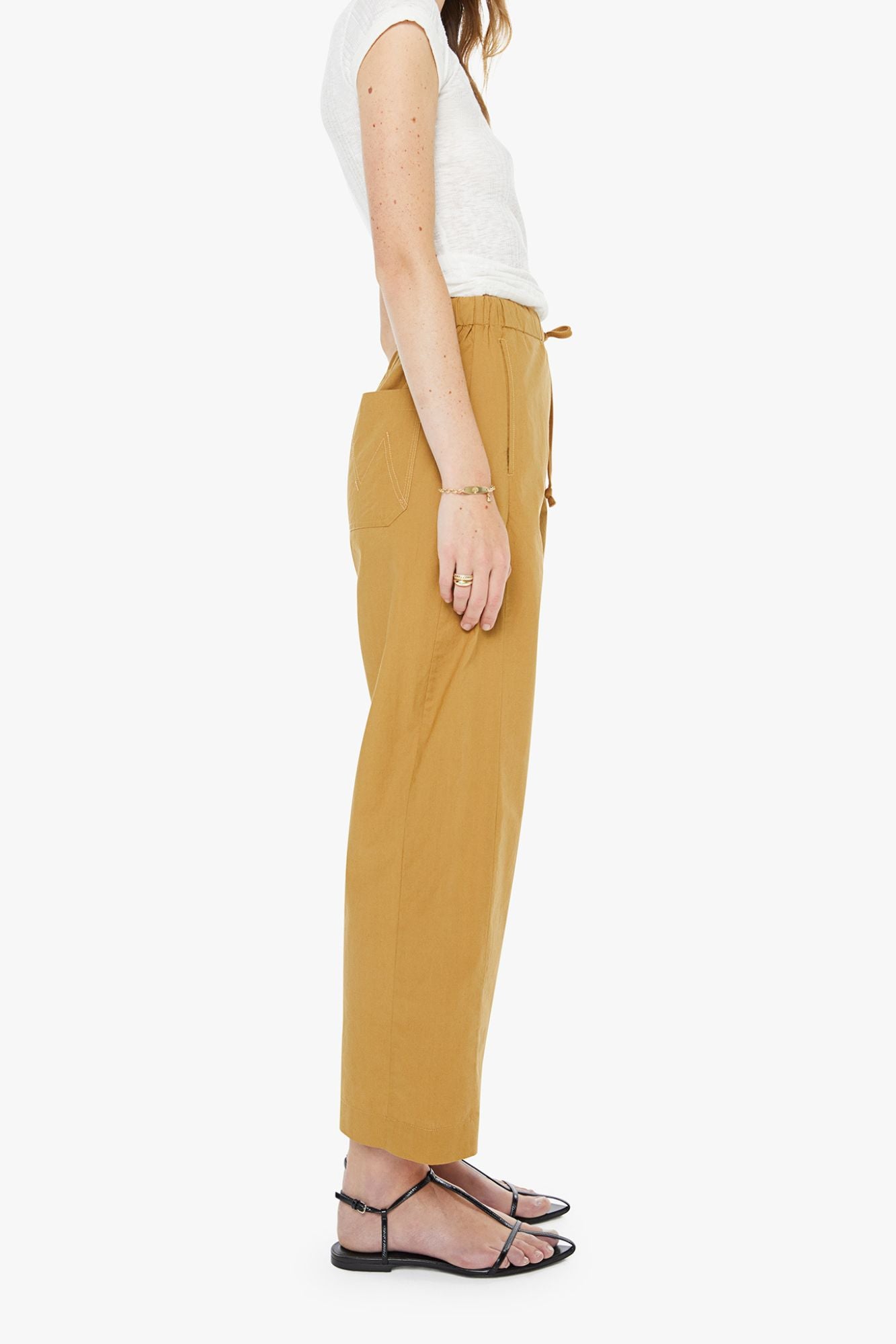 The Drawn Half-Pipe Ankle combines effortless comfort with contemporary style. Crafted from 100% organic cotton, these super high-waisted pants feature a drawstring waistband for a customizable fit and a wide, curved leg that flows gracefully to the ankle. The clean hem and light khaki tone make them versatile enough for everyday wear or elevated casual looks. Perfect for those seeking sustainable fashion without compromising on silhouette or comfort.