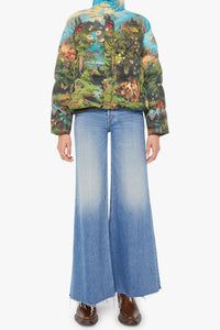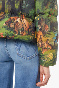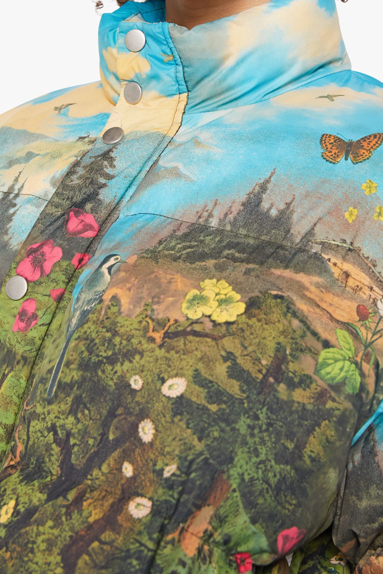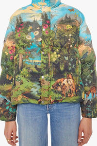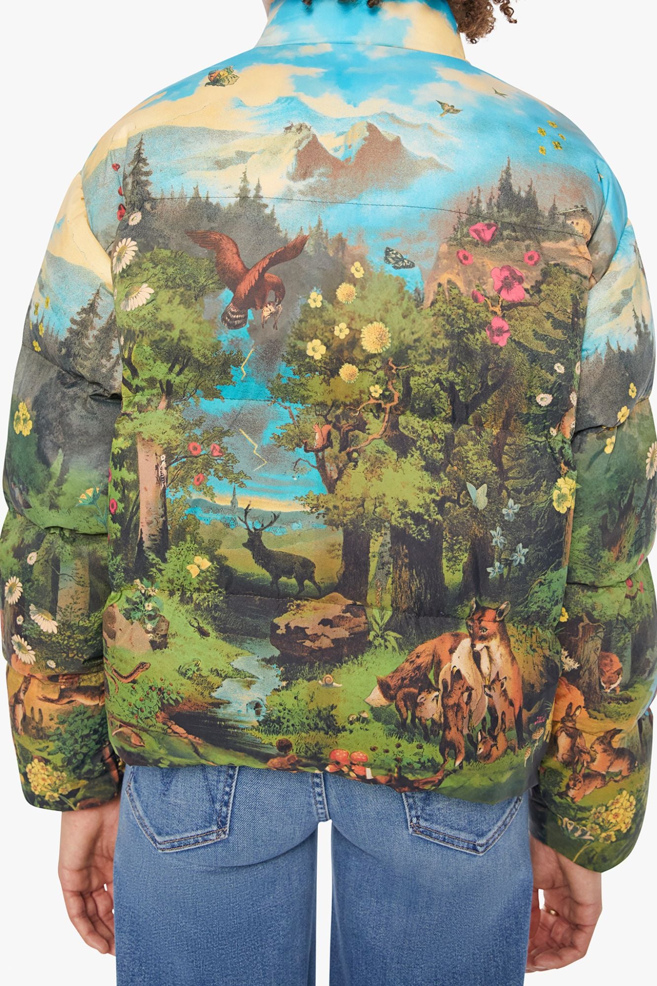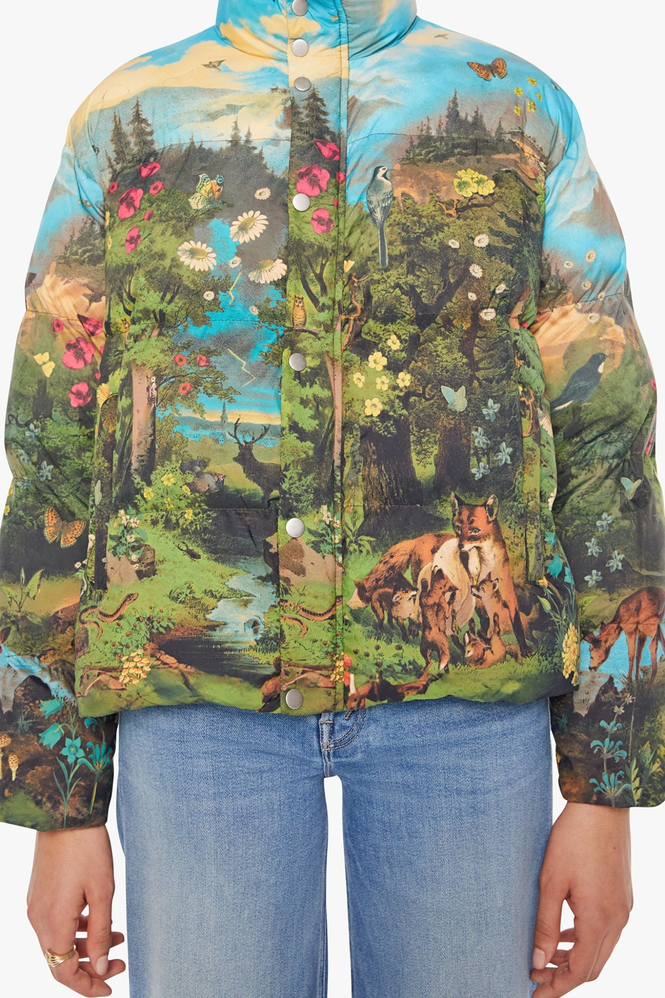 Get ready to turn heads on every adventure with this fun-loving puffer jacket that refuses to blend in. The cozy quilted fabric keeps you warm while the high collar and clever zip-snap combo let you customize your vibe. Slip your hands into the slit pockets, rock the boxy crop that flatters everyone, and let that gorgeous pastoral graphic do the talking. Whether you're chasing scenic views or just vibing around town, this jacket brings personality and comfort in one delightfully colorful package. Your wardrobe just got a whole lot more interesting.