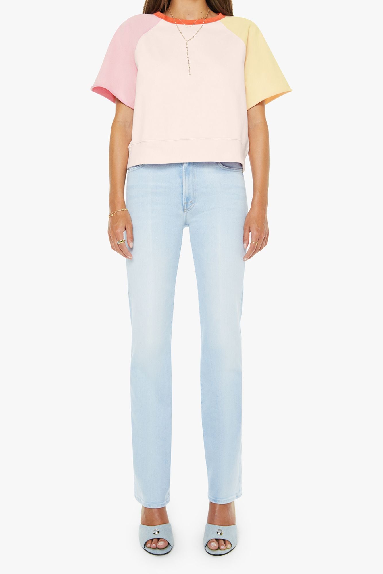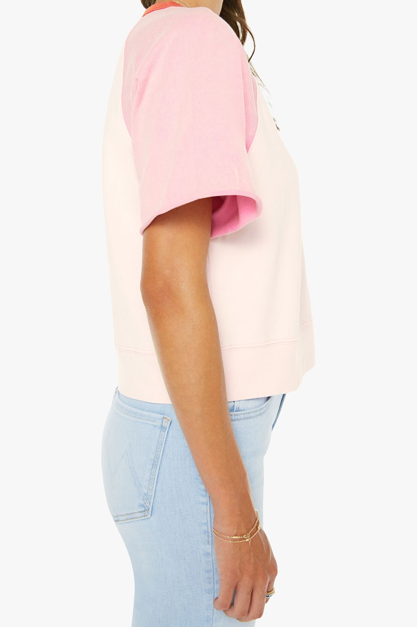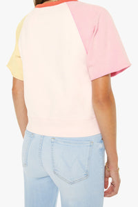 The Quick Dip is a playful crewneck sweatshirt that blends comfort with contemporary style. Crafted from 100% cotton, it features cut-off sleeves and a cropped, ribbed hem for a modern silhouette. The soft color palette—pale peach, baby pink, and pastel yellow—is accented with vibrant orange trim at the neckline, creating a cheerful, eye-catching contrast. Perfect for layering or wearing solo, this piece brings effortless warmth and personality to any casual wardrobe.