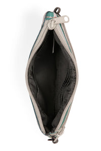 Cross body wallet, fixed rope wrist and shoulder strap that can detach with metal spring hook hardware, main compartment with zip closure and multiple cash and card slots, back exterior zip pocket.