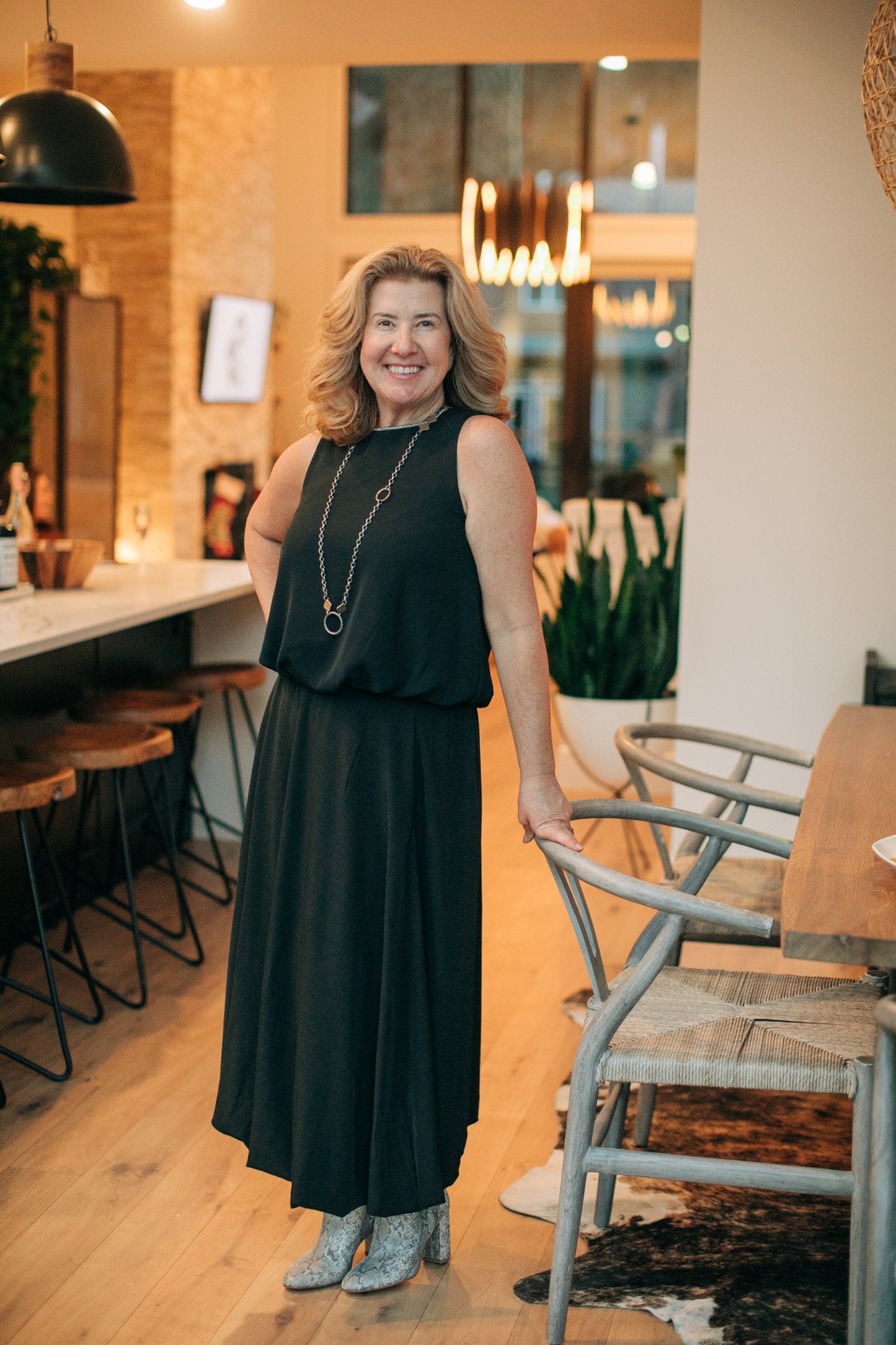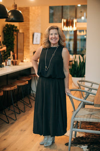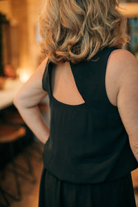 Sleeveless top with straight fit, rounded neckline trimmed with subtle metallic detail, and button-closure back keyhole. Fluid drape with softly rounded hem.