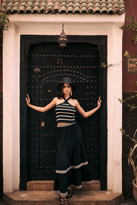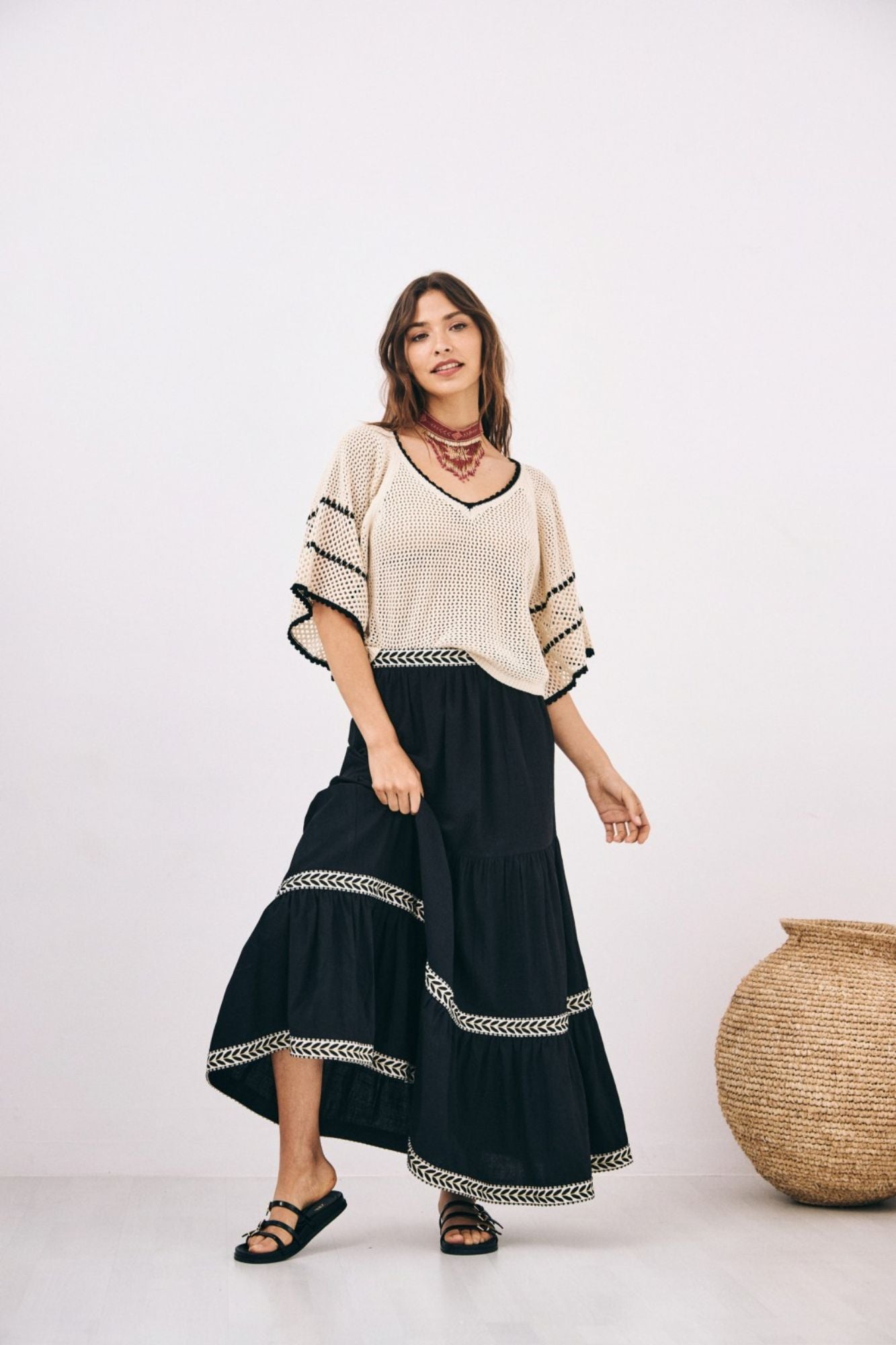 This elegant long skirt features a solid color design enhanced with delicate embroidered tape details, adding a touch of sophistication to your wardrobe. Crafted from soft cotton, it offers comfort and breathability for all-day wear. The invisible zipper closure ensures a seamless look while providing easy dressing. Perfect for dressing up or down, this skirt combines style and practicality effortlessly.