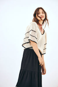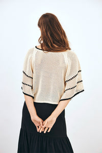 This open-knit sweater features wide short sleeves and a flattering V-neckline, enhanced by a stylish contrast-color ribbon detail. Its breathable design offers comfort and effortless style, making it a versatile addition to your wardrobe for layering or wearing on its own. Perfect for adding a chic, relaxed touch to any outfit.