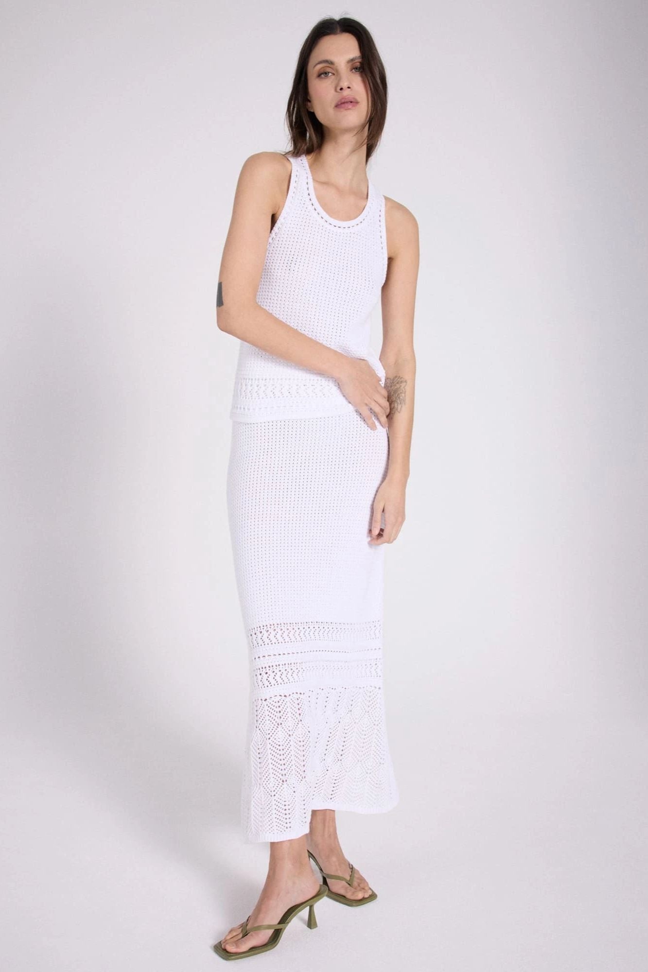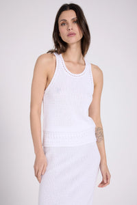 Introducing the Shary Knit Tank, the perfect addition to any wardrobe. This women's tank top features a round neckline and sleeveless design, with an openwork detail that adds a touch of elegance. Made from 100% cotton, it offers a fitted cut for a flattering and comfortable fit. Elevate your style with this must-have piece!