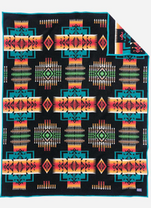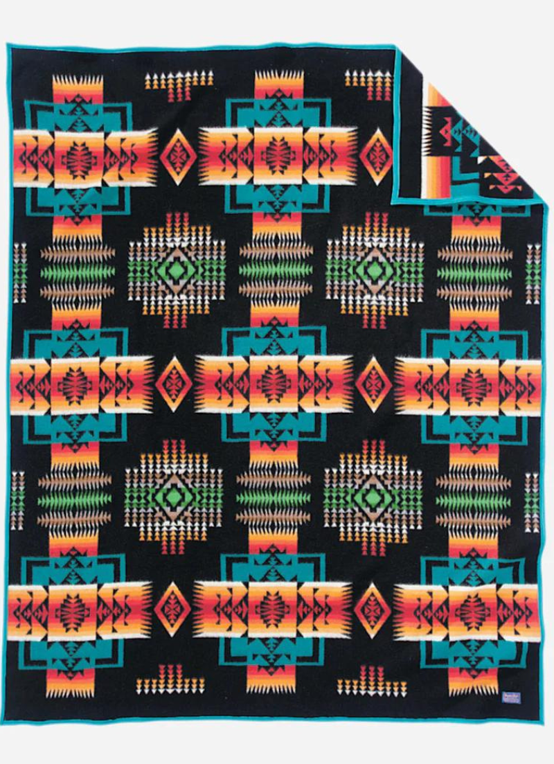 First woven in the 1920s, this USA-made wool blanket has been one of our most popular designs ever since. Chief Joseph led the Nez Perce tribe native to northeastern Oregon in the late 1800s. Widely admired for protecting his people and speaking the truth, he is honored with this design, symbolizing bravery. Bold arrowheads represent the chief's courage, strength, and integrity. Reverses for two different looks.