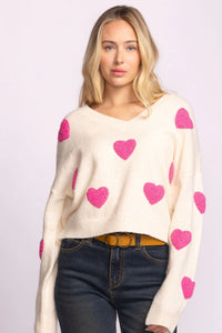 Wrap yourself in the Espera Sweater—a dreamy long-sleeve knit that's as soft as a cloud and twice as huggable. Adorned with charming heart appliqués, this cozy layer brings instant warmth and whimsy to your everyday style. Throw it on with your favorite jeans for laid-back vibes, or pair it with a skirt when you're feeling a little extra. It's the kind of sweater that becomes your go-to, whether you're curling up at home or heading out for an adventure.