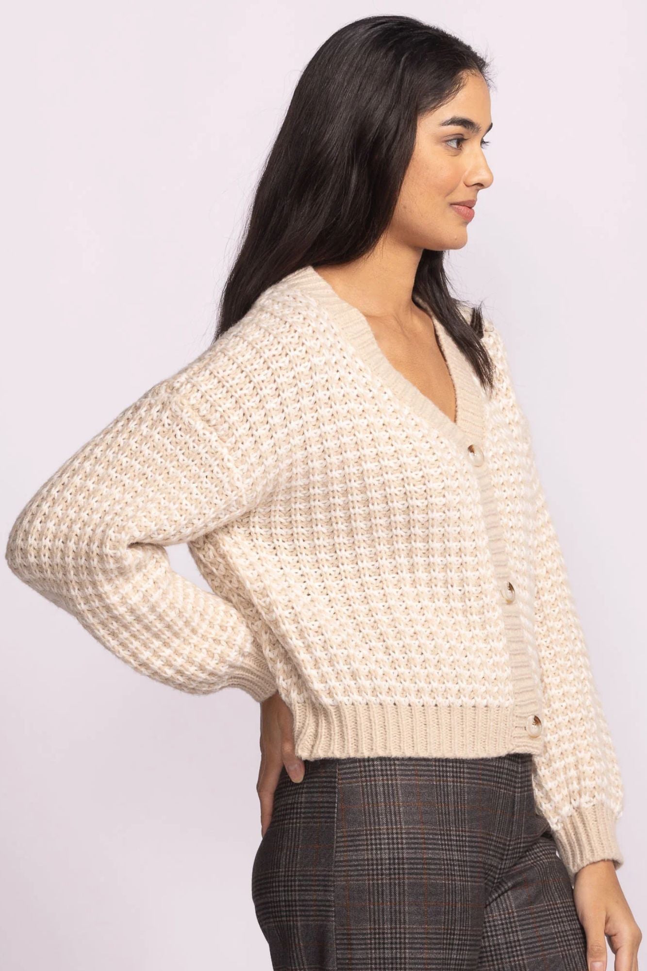 Meet your new favorite layering piece! The Evan Sweater brings cozy vibes with its two-tone knit design and relaxed silhouette. Featuring drop sleeves and a flattering V-neckline, this cardigan transitions seamlessly from office to weekend. Throw it over your work outfits for instant polish, or pair it with jeans when you're keeping things casual. Comfort meets style in this effortless essential that'll have you reaching for it again and again.