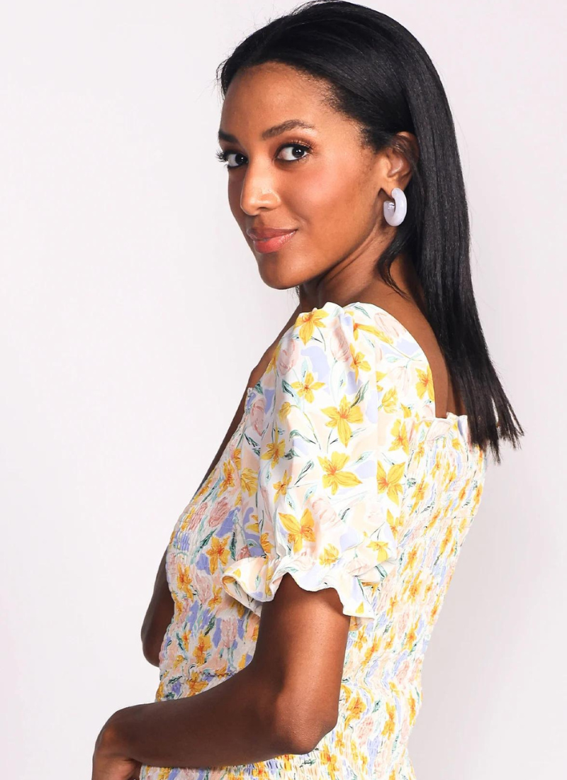 This bright and soft floral print will make you stand out while the square neckline and smocked bodice provide a flattering fit. Perfect for those who want to have some fun and make a statement with their wardrobe.