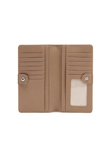 Introducing the Sophie Wallet: with 12 card slots, 4 bill slots, 1 clear ID window, and a back zip compartment, this wallet has the perfect amount of storage. The button snap closure provides a secure hold, making it great for on-the-go use. Stay organized and stylish with the Sophie Wallet!