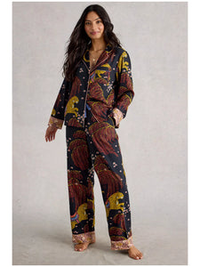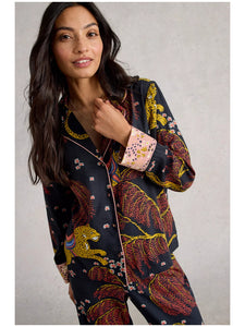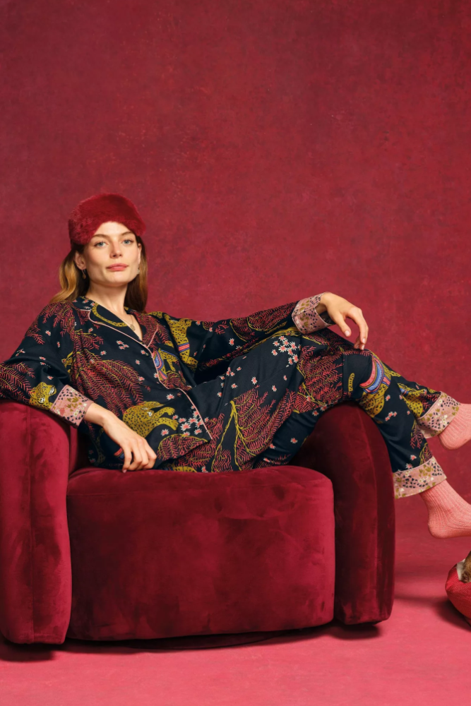 A pyjama shirt with a contrasting print on the cuffs, a little colour pop and embroidery details. Add the matching bottoms and consider this your excuse to lounge.