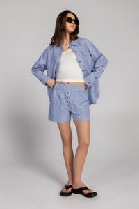 Experience effortless summer style with the Amalfi Short. Featuring a mid-rise, elastic waistband with drawcord, and a relaxed fit, these striped shorts offer comfort and freedom of movement. Crafted from soft, breathable woven fabric with vertical stripes and a clean hem, they pair perfectly with the Amalfi shirt for a chic, coordinated look. Ideal for warm days, these shorts combine lightweight design and a flowing cut to keep you cool and stylish all season long.