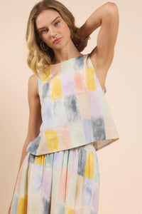 Make a bold impression with the Petrichor Sleeveless Top from Sadie & Sage. Its vibrant multi-colored print and sleek round neck design bring a fresh, lively touch to your wardrobe. The back button placket adds a subtle detail that enhances its chic appeal. Perfect for those who want to express their unique style effortlessly, this top is a must-have for adding color and confidence to any outfit.