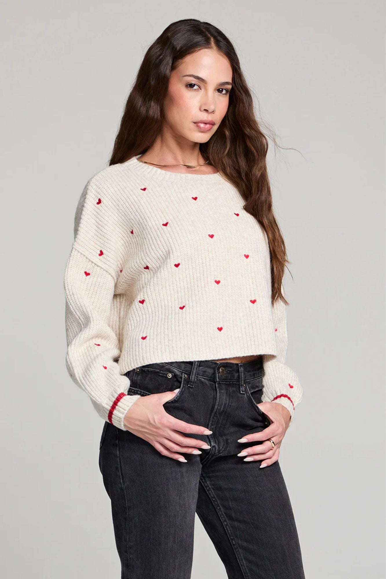 The Charmer Sweater lives up to its name with a touch of romance, featuring petite heart detailing throughout the body. Its easy, boxy fit makes it a versatile addition to any closet. This sweet style is sure to charm anyone at first glance.