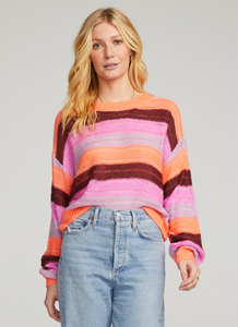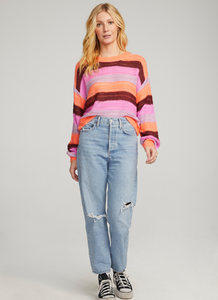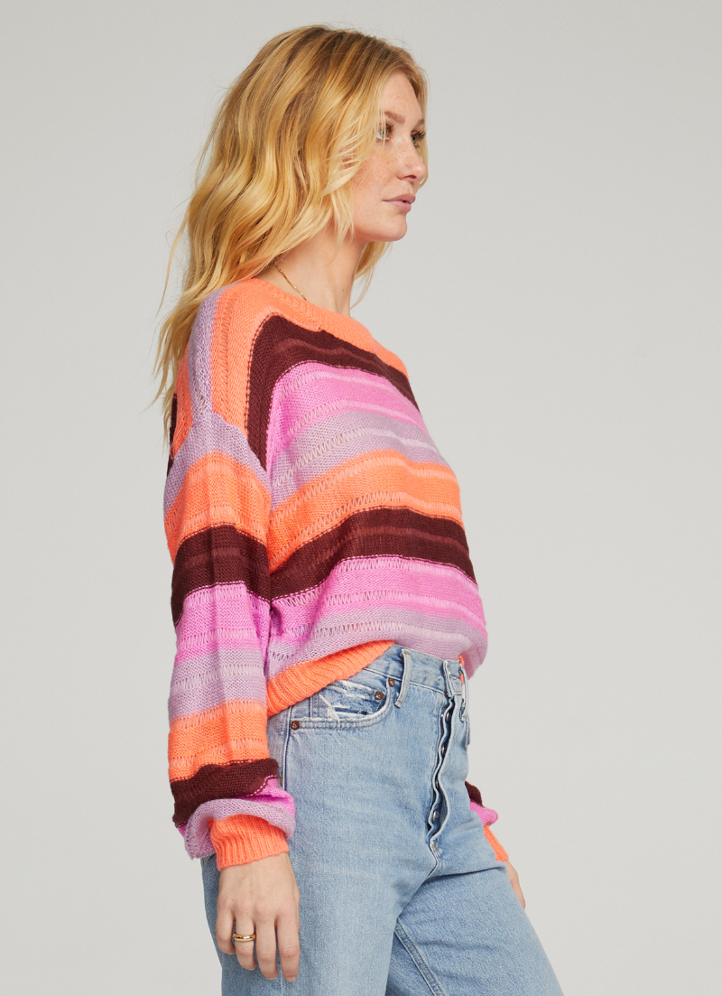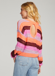 Make a statement this season in the Jed Sweater. Embrace a blend of a classic style with a burst of vibrant multi-colors and a playful back cut-out. Style with jeans and boots. Model is 5'9" and wearing size small.