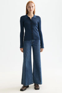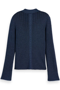 Fitted cardigan with a soft collar and a fine rib knit, finished with a hint of metallic thread.