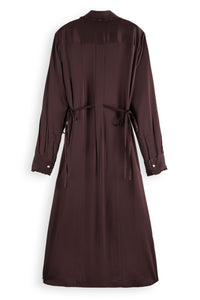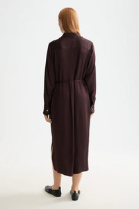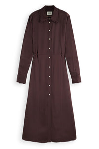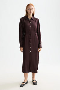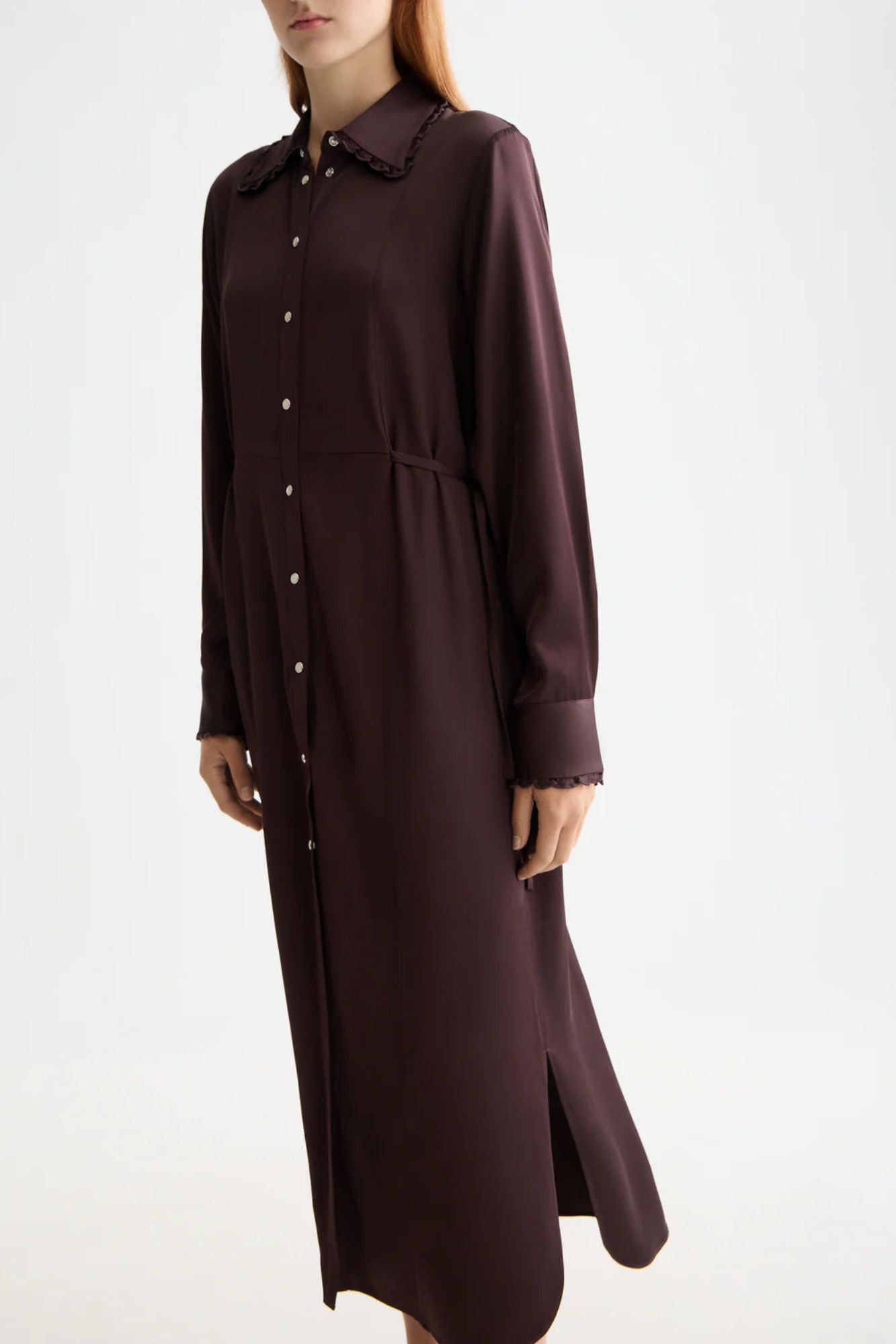 A sophisticated midi shirt dress featuring a ruffled collar and tie waist for shape. Perfect for both professional and casual settings, this versatile piece works from office to evening with effortless style.