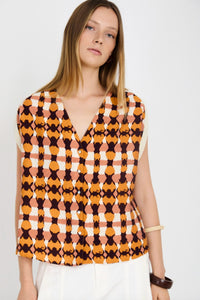 Effortless elegance meets modern edge with this sleeveless viscose-blend blouse. The soft tie-dye print adds visual interest, while the V-neckline creates a flattering silhouette. Front button fastening offers easy styling versatility. Metallic ribbon shoulder straps elevate the look with a contemporary touch, and the straight fit ensures comfortable, polished wear for any occasion.