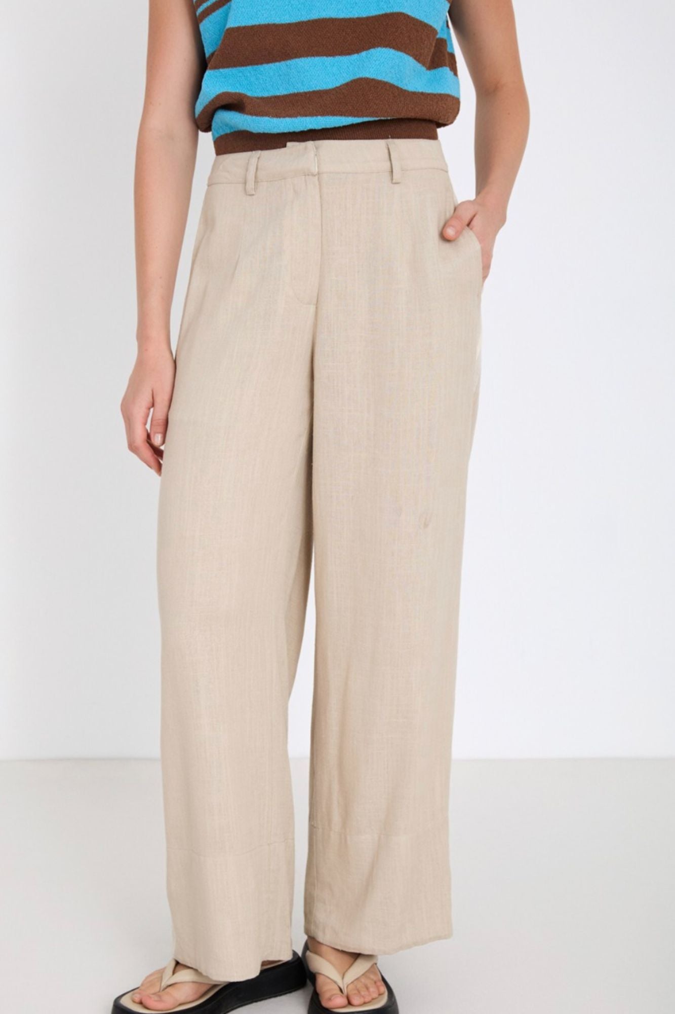 Effortless elegance meets comfort in these linen-viscose blend trousers. The mid-rise straight-leg silhouette flatters while the contrast side stripe adds contemporary style. Functional side pockets and a secure front button-zip closure complete the design. Perfect for warm-weather dressing, whether you're heading to the office or weekend plans.